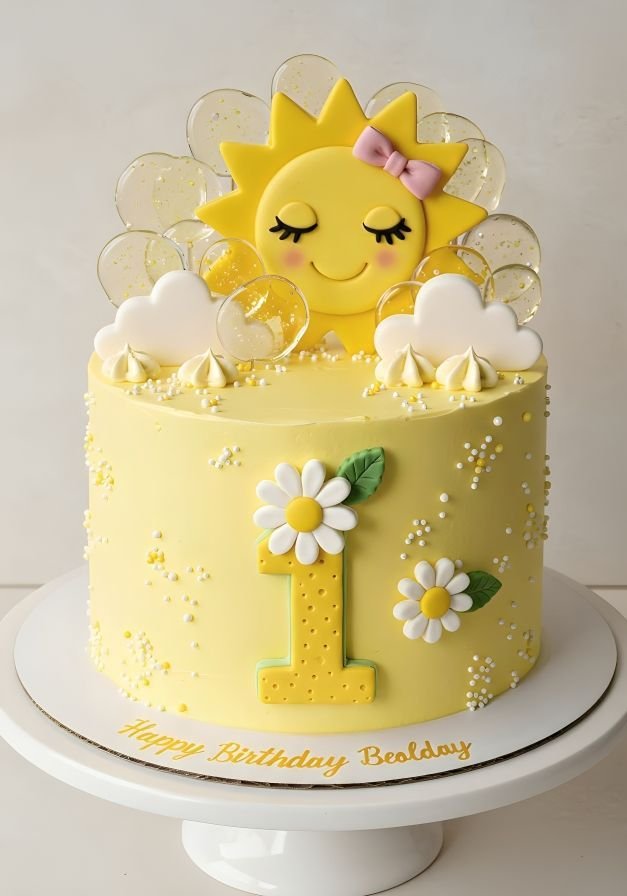 This adorable cake is a ray of sunshine, crafted with a cheerful yellow frosting and a cute sun design. Fluffy clouds and small daisies enhance the happy theme.