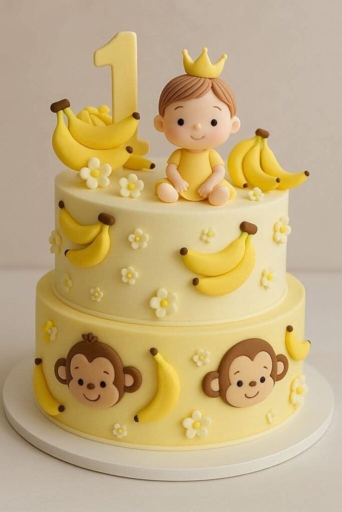 The bottom tier is adorned with adorable monkey faces and banana bunches. This cute design gives the cake a whimsical, jungle-themed feel.