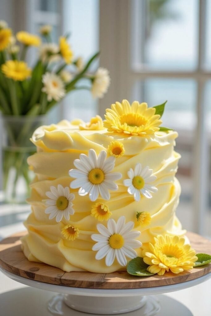 This bright and cheerful cake is covered in a lovely, pale yellow frosting. The entire surface, including the cake board, is adorned with charming white daisies.
