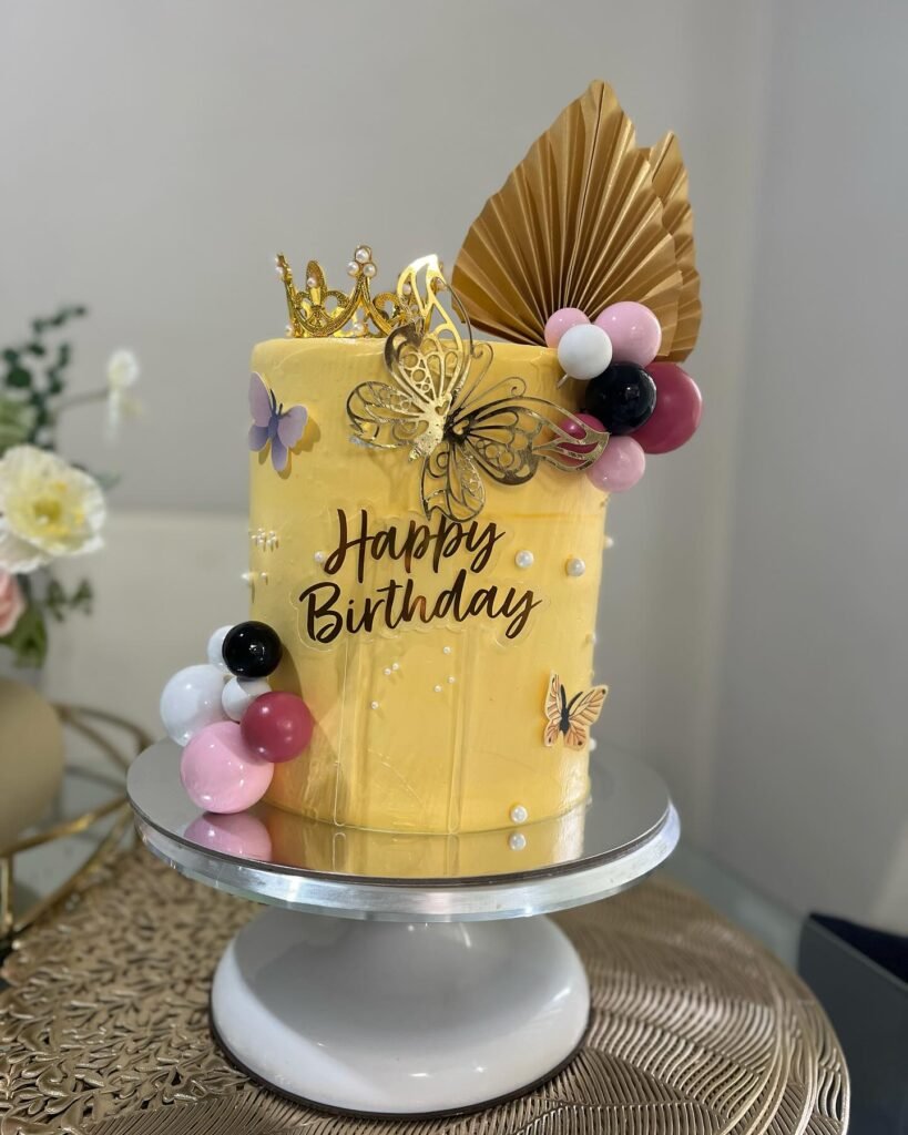 It is adorned with a stunning golden crown and a detailed butterfly topper. A handwritten “Happy Birthday” message adds a personal and warm touch.