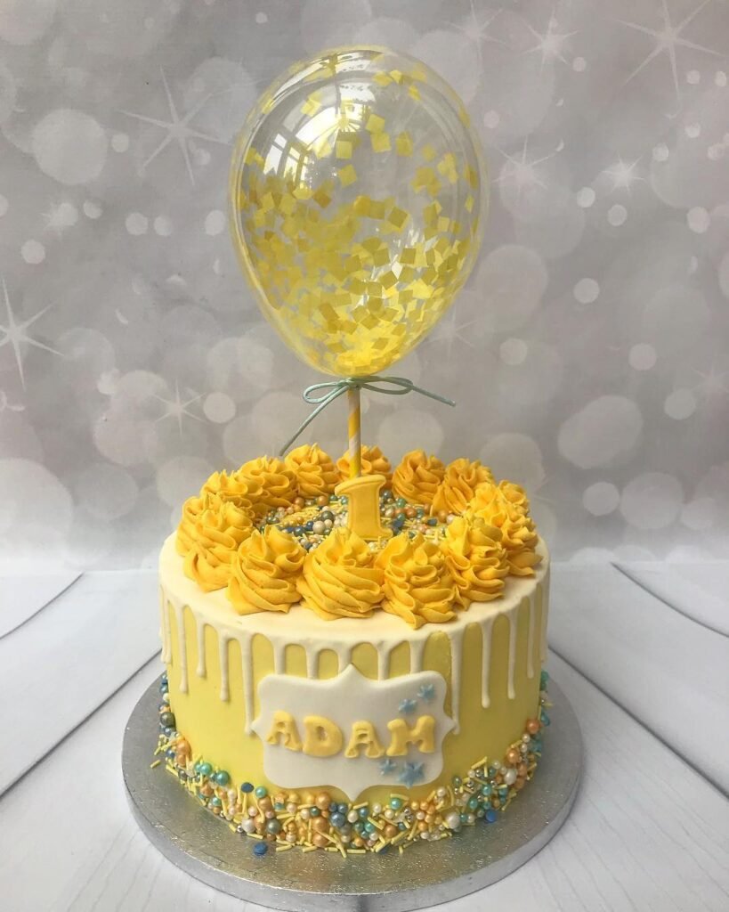 The top is adorned with piped yellow buttercream swirls and a personalized number ‘1’ topper. A vibrant, confetti-filled balloon sits high above.
