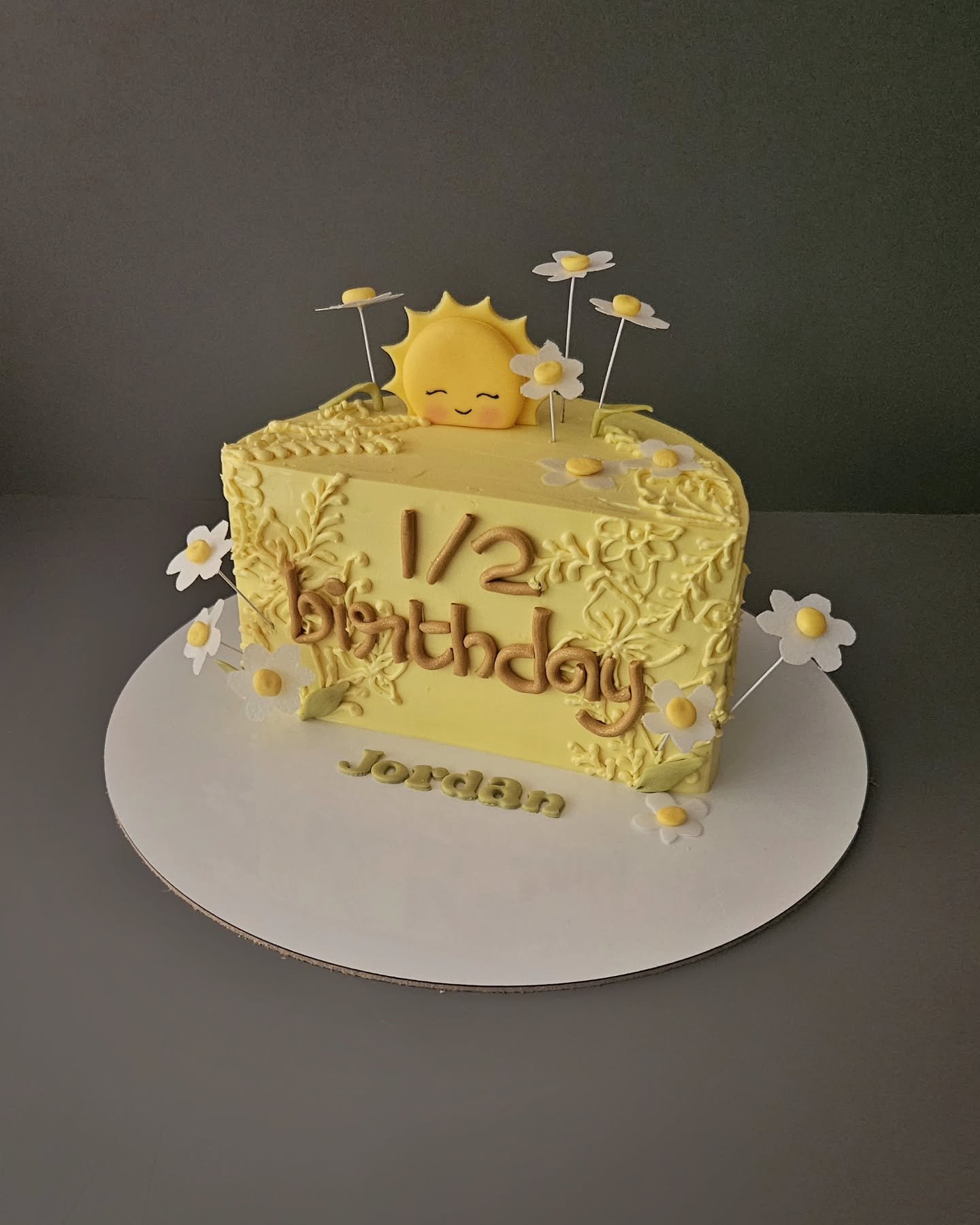 A cute sun figurine and white daisies add a cheerful touch. The inscription “1/2 Birthday” is prominently featured in a golden font on top.