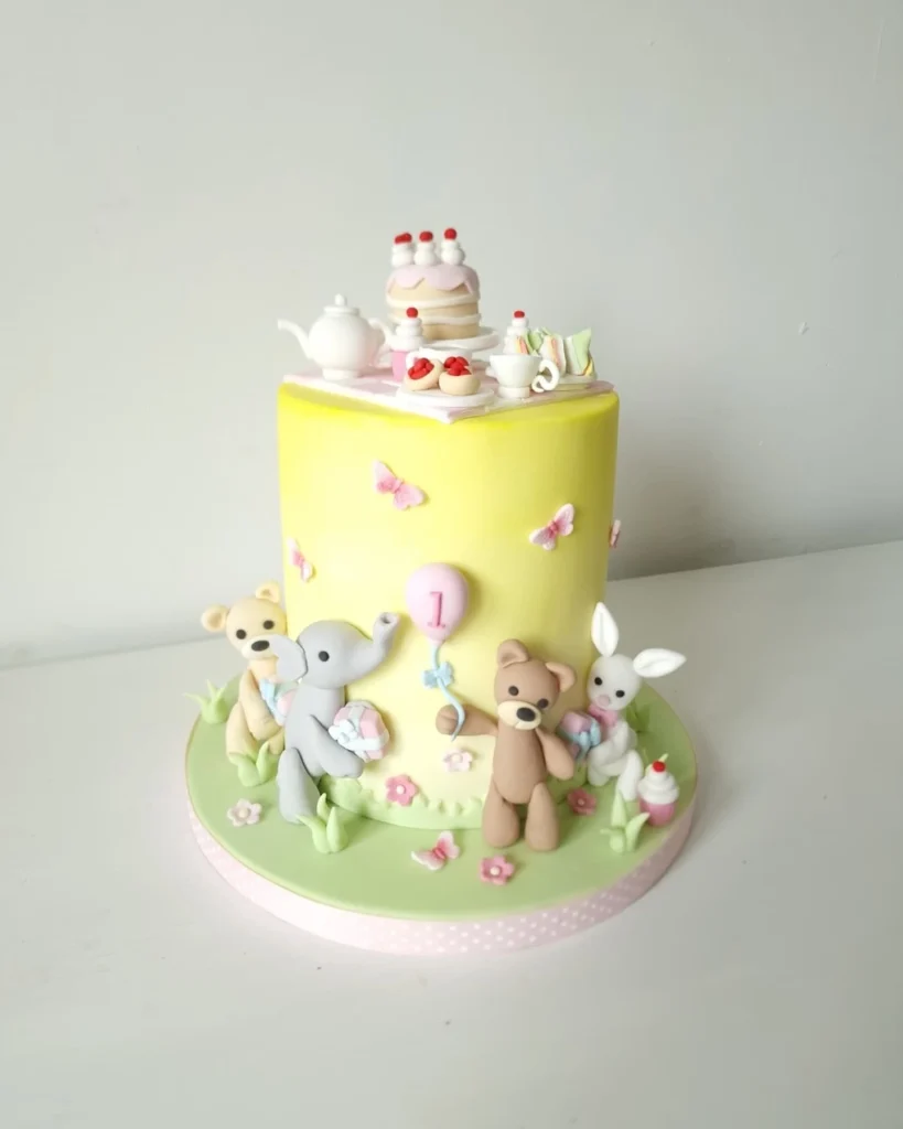 This whimsical cake is a playful scene of charming animal figurines enjoying a tiny tea party. The cake itself is a gentle, smooth yellow and has sweet little butterfly designs.