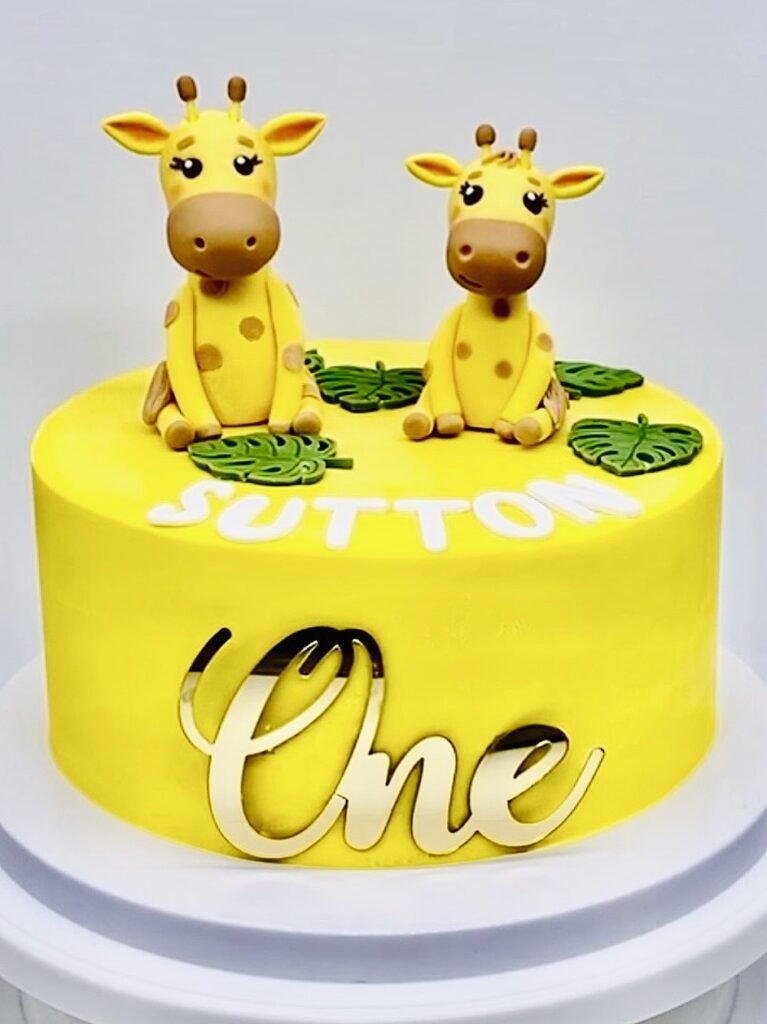 The top of the cake is decorated with two cute giraffes and green leaves. The name “SUTTON” is also spelled out in white letters on top.
