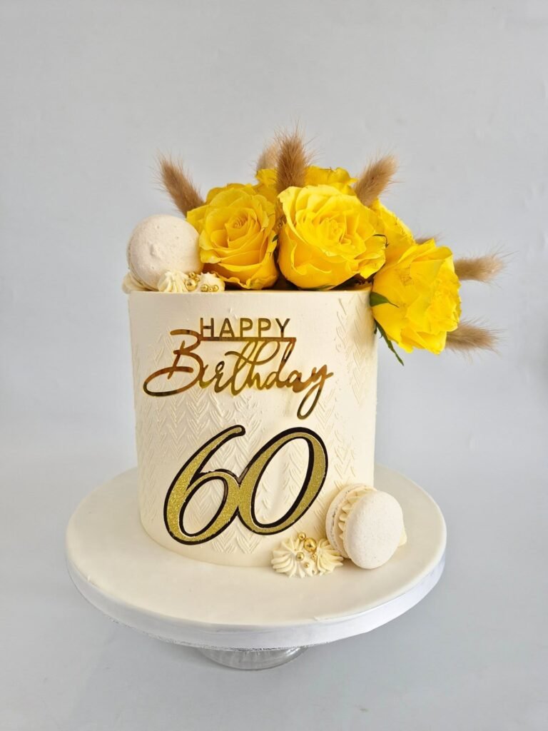 A large, shiny gold “60” and a “Happy Birthday” message are prominently displayed on the front. These details make it a grand and celebratory centerpiece.