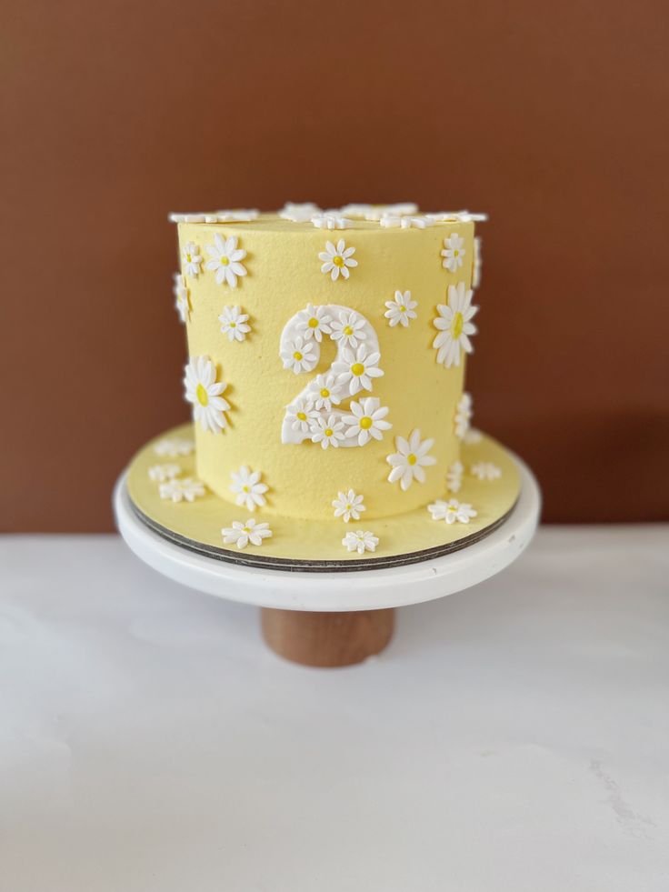 This vibrant cake is a celebration of cheerfulness, covered in a sunny yellow frosting and adorned with countless white daisies. The playful floral design continues all around.